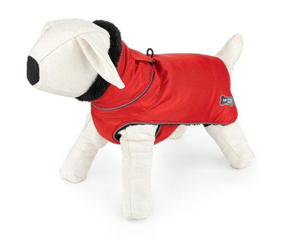 Okrycie z miękkim kołnierzem  dla psa rozmiar S   Zimno potrafi dopiec każdemu. Szczękające zęby, czerwony nos i katar to tylko niektóre przykre skutki tego zjawiska. Wystarczy jednak kilka warstw ubrań, a już czujemy się lepiej, chronieni przed chłodem. To samo tyczy się naszych psiaków- pomimo, że ich ciała pokrywa naturalna warstwa sierści, to przy niższych temperaturach z pewnością docenią dodatkowe okrycie w postaci ubrania. Okrycie dla psa z miękkim kołnierzem wspomoże naszego pupila warstwą oddychającego, trzymającego ciepło materiału. Jego rozłożysty kształt i wysunięty szeroki kołnierz pozwalają na ochronę jak największej powierzchni ciała psa, bez niepotrzebnego krępowania ruchów. Ubranko łatwo zapina się paskami na rzepy, które umieszczone są na klatce piersiowej psa. Dodatkowo, materiał z którego zostało wykonane jest wodoodporne i można prać je w pralce w temperaturze 30 stopni. Dostępne są rozmiary XS (25cm), XS (30cm), S (40cm), M (50cm), L (60cm) oraz kolory granatowy i czerwony.   Rozmiar: S, 40cm Materiał wykonania: ... Kolor: czerowny