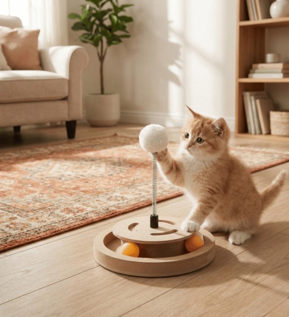 Kompaktowy drapak dla kota z piłką na sprężynie i torem z piłeczkami. Idealny do małych przestrzeni – zapewnia zabawę, ruch i realizację naturalnych kocich instynktów.