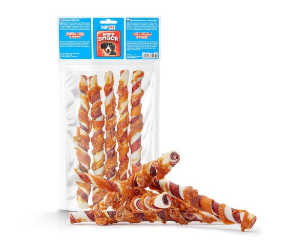 Pałka 3-kolor z kurczakiem, 25 cm dla psa Smaczna przekąska dla dużych i średniej wielkości psów. Biała, prasowana pałka ze skóry wołowej jest owinięta mięsem z piersi kurczaka i skórą wołową. Wygląda bardzo apetycznie i zachęcająco dla każdego psa. To pyszna przekąska ze zdrowym źródłem białka oraz twardy gryzak, który dostarczy psu długotrwałego zajęcia, jednocześnie dbając o zaspokojenie potrzeby gryzienia i chroniąc przed odkładaniem kamienia nazębnego. Ważne informacje: jest przysmakiem dla psa, dlatego może służyć jako nagroda, zaspokaja potrzebę żucia i gryzienia, zapewnia psu zajęcie na dłuższy czas, w naturalny sposób dba o czyste zęby naszych pupili, zapobiega osadzaniu się kamienia nazębnego, masuje dziąsła, wyróżnia się wysoką zawartością białka i niskim poziomem tłuszczu, jest doskonała dla każdego psa, także dla psów mających problem z utrzymaniem prawidłowej wagi, ściera naloty bakteryjne osadzające się na zwierzęcych zębach, mogące być przyczyną nieświeżego oddechu i chorób przyzębia, żucie takiego gryzaka rozładowuje napięcie i łagodzi wszelkie objawy stresu u psów, nie wydaje brzydkiego zapachu jak surowe kości, należy podawać między posiłkami Pamiętaj! Przysmaki dla psów nie mogą zastąpić pokarmu podstawowego -  pomimo, że dostarczają niektórych składników pokarmowych, są tylko przyjemnym urozmaiceniem codziennej diety pupila. Nie należy podawać szczeniętom poniżej 3 miesiąca życia.   Długość: 25 cm Opakowanie: 0,350 kg, 5 szt. Skład: 20% mięso z piersi kurczaka, 75,99% skóra bydlęca, 0,01% barwnik, 1% gliceryna, 1% sorbitol, 1,5% skrobia, 0,5% sól Analiza: białko surowe min. 65%, oleje i tłuszcze surowe min. 2%, włókno surowe max. 0,2%, popiół surowy max. 2%, wilgotność max. 18%   Nie zawiera sztucznych zapachów ani konserwantów. Posiada długi termin przydatności do spożycia!