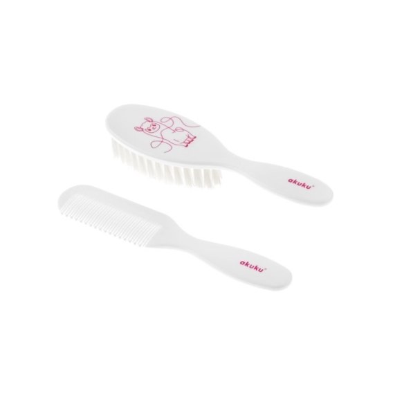Bezpieczna i delikatna szczotka do czesania dziecięcych włosów wykonana z włosia sztucznego w zestawie z grzebieniem. Miękkie włosie idealnie nadaje się do pielęgnacji delikatnych włosków niemowlaka, a dzięki właściwościom antystatycznym nie elektryzuje ich. Grzebyk posiada zaokrąglone końce, przez co chroni delikatną skórę dziecka.