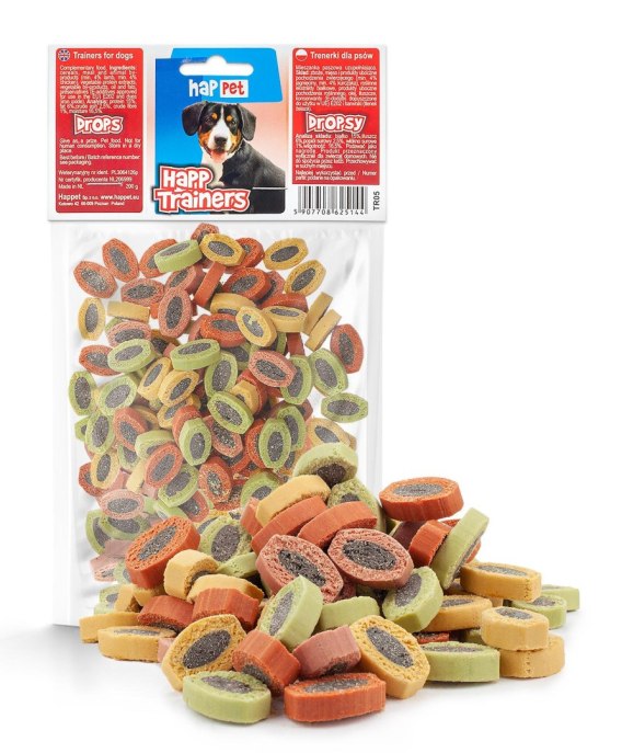HAPP TRAINERS Dropsy, 200g z zawieszką Trenerki dla psów Idealnie nadają się do treningu i szkolenia. Trenerki firmy Happet występują w przeróżnych kształtach i kolorach. Mają niewielkie rozmiary, dzięki czemu idealnie mieszczą się w kieszeni, czy specjalnej saszetce na przysmaki. Jest to niezbędny produkt znajdujący swoje zastosowanie podczas treningów i spacerów - za każde poprawnie wykonane polecenie i posłuszeństwo, możesz nagrodzić swojego pupila zdrową i smaczną porcją przyjemności. Smakołyki na bazie zbóż i mięsa są lekkostrawne i mają przyjemny aromat, bez problemu można podawać je pupilom każdej rasy, a nawet psom z nadwagą. Podstawowe cechy produktu: małe, chrupiące ciastka zbożowe o mięsnym smaku, ciastka mają ok. 2,5 cm długości, nadają się zarówno dla psów dorosłych, jak i szczeniąt, ciasteczka mają formę dropsów, doskonale smakują, ponieważ zawierają zarówno produkty zbożowe oraz mięso, idealne podczas szkolenia lub spaceru, lekkostrawny skład - bezpieczny dla żołądka, w naturalny sposób dbają o czyste zęby naszych pupili, ścierają naloty bakteryjne osadzające się na zwierzęcych zębach, co pomaga zachować świeży oddech Skład: zboże, mięso i produkty uboczne pochodzenia zwierzęcego (min. 4% jagnięciny, min. 4% kurczaka), roślinne ekstrakty białkowe, produkty uboczne pochodzenia roślinnego, olej, tłuszcze, konserwanty E202 (E- dodatki dopuszczone do użytku w UE) i barwniki (tlenek żelaza) Analiza składu:białko 15%, tłuszcz 6%, popiół surowy 2,5%, włókno surowe 1%, wilgotność 16,5%. Uwaga! Przysmak nie nadaje się do spożycia przez ludzi! Produkt posiada długi termin przydatności do spożycia. Na każdym opakowaniu znajduje się weterynaryjny numer identyfikacyjny - potwierdzający dopuszczenie produktów do sprzedaży (PL3064126p)