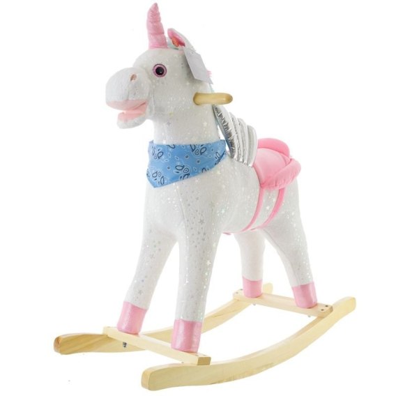 Zabawka wykonana z bardzo miłego w dotyku materiału. Konik posiada wygodne siedzisko ze strzemionami i lejcami oraz drewniane rączki. Zabawka po naciśnięciu ucha wydaje różne dźwięki i rusza ogonkiem i mordką.