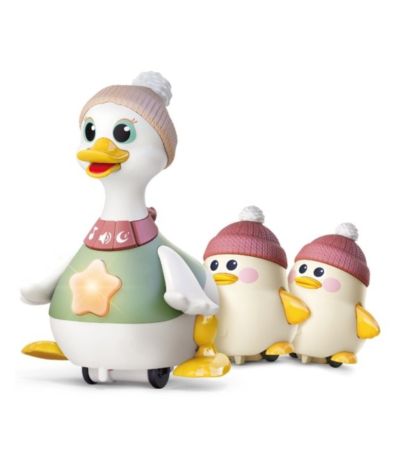 Kwa-kwa, a któż to nadciąga? To kacza rodzinka, mamusia i jej dwa urocze maluchy! Ta zgrana ekipa wesoło podąża przed siebie, przy dźwiękach miłych dla ucha piosenek. Kaczuszki łączą się ze sobą, jeżdżąc jedna za drugą „gęsiego", ale potrafią poruszać się także w pojedynkę. Dodatkowo, małe kaczuszki można połączyć ze sobą skrzydełkami, aby tańczyły, kręcąc się naokoło lub grzecznie spacerowały w parze. Kacza mama wyposażona została w świecącą gwiazdkę na brzuszku oraz dwa przyciski, aktywujące melodie oraz trzeci, środkowy, służący regulacji głośności. Duża kaczka działa w trybie dynamicznym, opisanym wyżej, oraz w trybie statycznym, który przekształca ją w „lampkę" nocną, odtwarzającą kołysanki.