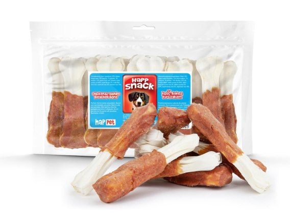 Kość biała z kurczakiem 10szt. dla psa Biała, prasowana kość ze skóry wołowej - owinięta mięsem z piersi kurczaka. To pyszna przekąska ze zdrowym źródłem białka oraz twardy gryzak, który dostarczy psu długotrwałego zajęcia, jednocześnie dbając o zaspokojenie potrzeby gryzienia i chroniąc przed odkładaniem kamienia nazębnego. Ważne informacje: jest przysmakiem dla psa, dlatego może służyć jako nagroda, zaspokaja potrzebę żucia i gryzienia, zapewnia psu zajęcie na dłuższy czas, w naturalny sposób dba o czyste zęby naszych pupili, zapobiega osadzaniu się kamienia nazębnego, masuje dziąsła, wyróżnia się wysoką zawartością białka i niskim poziomem tłuszczu, jest doskonała dla każdego psa, także dla psów mających problem z utrzymaniem prawidłowej wagi, ściera naloty bakteryjne osadzające się na zwierzęcych zębach, mogące być przyczyną nieświeżego oddechu i chorób przyzębia, żucie takiego gryzaka rozładowuje napięcie i łagodzi wszelkie objawy stresu u psów, nie wydaje brzydkiego zapachu jak surowe kości, należy podawać między posiłkami Pamiętaj! Przysmaki dla psów nie mogą zastąpić pokarmu podstawowego - pomimo, że dostarczają niektórych składników pokarmowych, są tylko przyjemnym urozmaiceniem codziennej diety pupila. Nie podawać szczeniętom poniżej 3 miesiąca życia. Długość: 12,5 cm, Opakowanie: 0,57 kg, 10 szt. Skład: 22% mięso z piersi kurczaka, 74% skóra bydlęca, 1% gliceryna, 1% sorbitol, 1,5% skrobia, 0,5% sól Analiza: białko surowe min. 60%, oleje i tłuszcze surowe min. 2%, włókno surowe max. 2%, popiół surowy max. 2%, wilgotność max. 18% Nie zawiera sztucznych zapachów, barwników ani konserwantów. Produkt posiada długi termin przydatności do spożycia!