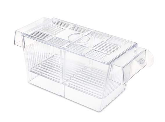 Kotnik plastikowy rozm. L Pływający duży kotnik dla ryb żyworodnych (gupik, molinezja, mieczyk, platynka). Młode nowonarodzone ryby opadając na dno przedostają się przez ruszt do dolnej komory, dzięki czemu są chronione przed ewentualnym kanibalizmem. Kotnik jest wyposażony w dwie przyssawki do przytwierdzenia do szyby, może też pływać na powierzchni wody dzięki specjalnym komorom powietrznym. Kotnik można podzielić na dwie komory lęgowe specjalną przegródką. Specjalne szczeliny na bokach zapewniają konieczną wymianę wody z akwarium ogólnym a szczeliny w pokrywie umożliwiają wymianę powietrza. Pokrywa zabezpiecza dorosłe ryby przed wyskoczeniem z kotnika. Po przeniesieniu dorosłych samic do akwarium ogólnego kotnik stanowi zbiornik dla bezpiecznego wychowu narybku. Jest też doskonałym azylem dla ryb osłabionych lub chorych na czas leczenia.   Wymiary: (dł. / szer. / wys.) 225 x 95 x 100