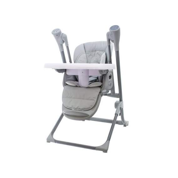 Krzesełko do karmienia z funkcją huśtawki. Krzesełko posiada 6 dostępnych wysokości i cztery pozycje regulacji oparcia. Funkcja huśtawki dostępna w najniższej pozycji. Możliwość ustawienia tacy do karmienia w trzech pozycjach. Blat jest dwuczęściowy i może być dostosowywany do posiłków lub zabawy. Regulowany podnóżek. Produkt posiada panel kontrolny, na którym umieszczone są: pięć diod pokazujących aktualną prędkość huśtania, timer z trzema przedziałami czasowymi, przycisk muzyczny.