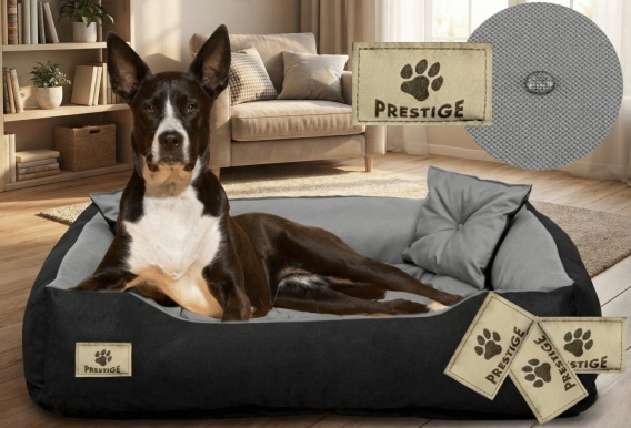 WODOODPORNE legowisko dla psa PRESTIGE w kolorze ciemnoszarym, z GRAWEROWANYM logo Prestige!