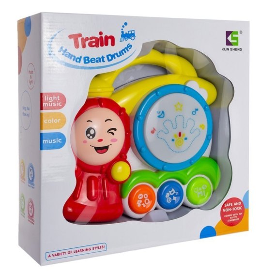 Multimedialny bębenek w kształcie lokomotywy. Zabawka rozwija koordynację wzrokowo-ruchową oraz ćwiczy precyzję ruchu. Bogata kolorystyka i kształty wzbudzają zainteresowanie u dziecka. Dziecko naciskając klawisze pianina, uruchamia dźwięki, melodię lub odgłosy zwierząt natomiast uderzając w bębenek, zabawka emituje sygnały świetlne oraz dźwiękowe.