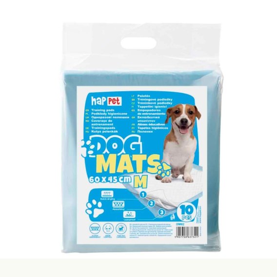 Podkłady higieniczne 60 x 45 cm Bardzo chłonne maty treningowe idealnie sprawdzą się jako narzędzie do nauki czystości dla szczeniąt, dla starszych i schorowanych zwierząt, jako wyściółka do transporterów. Podkłady są niezwykle przydatne w domu, jak również w podróży, zapewniają higienę i komfort. Można ułożyć je na podłodze lub wyścielać transporter. Dodatkową zaletą podkładów jest ich odporność na rozrywanie. Wymiary: 60 x 45 cm Opakowanie: 10 szt. Rozmiar Dog Mats 30 szt. 10 szt. 45 x 33 cm DM07 DM08 60 x 45 cm DM01 DM02 60 x 60 cm DM03 DM04 90 x 60 cm DM05 DM06 Jak nauczyć psa czystości? Umieść psa na macie Dog Mats w celu załatwienia jego potrzeb. Następnie należy go nagrodzić. Systematyczna powtarzalność tego rytuału jest kluczowa dla świadomości psa. Po upływie fazy służącej psu do przyzwyczajenia się należy przesuwać wkładkę dzień po dniu w kierunku drzwi wyjściowych, a w końcu poza nie. Zalety mat Dog Mats: Idealne do szkolenia higieny szczeniąt Odpowiednie dla starszych i schorowanych zwierząt Z absorbującym wodę i nieprzyjemne zapachy: pomaga utrzymać czystość i świeżość w toalecie Szybkoschnąca powierzchnia: już po 60 sekundach jest sucha i czysta Puppy Trainer to gwarancja najlepszej ochrony: rozłożyć między dnem a rantem kuwety, gotowe! Odpowiednie do transporterów Dostępne w trzech najpopularniejszych rozmiarach Składają się z trzech warstw:
