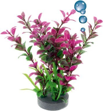 Roślina akwariowa, sztuczna, z kamieniem napowietrzającym Sztuczna roślina stworzona z myślą o miłośnikach akwarystyki! Potrafi urozmaicić każdą aranżację tworząc naturalny klimat w zbiorniku. Rośliny sztuczne można łączyć z innymi dekoracjami, oraz roślinami naturalnymi - większe grupy roślin o różnych rozmiarach wyglądają najatrakcyjniej i dają możliwość ochrony ryb i narybku. Ponadto dają schronienie w postaci cienia, oraz stanowią doskonałą kryjówkę. Roślina jest wykonana z tworzywa sztucznego, jednak po włożeniu do wody nie uwalnia żadnych szkodliwych substancji, jest całkowicie bezpieczna. Dodatkowo zamieszczona jest na kamieniu napowietrzającym, który z rozpyla strumień powietrza na drobne pęcherzyki zaopatrując wodę w tlen oraz stwarzając bardzo ciekawy efekt ściany bąbelków.   Wielkość: 19 cm Kolor: zielono - fioletowy
