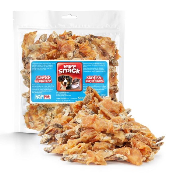 Sunfish z kurczakiem dla psa i kota Suszona ryba została owinięta w aromatyczne paski z piersi kurczaka - wspaniała przekąska wykonana w 100% z naturalnego mięsa. Jest to prawdziwy rarytas dla psów i kotów wszystkich ras. Drobne ryby to pokarm występujący w naturalnym środowisku zwierząt, stanowi bogate źródło energii, białka, nienasyconych kwasów tłuszczowych, a także witamin i składników mineralnych. Do jego produkcji nie użyto żadnych sztucznych substancji konserwujących, ani barwników. Przysmaki podaje się jako uzupełnienie codziennej diety, jako nagrodę podczas spaceru i treningu, a przy okazji również jako środek usuwający kamień nazębny oraz nalot bakteryjny. Ważne informacje: jest przysmakiem, dlatego może służyć jako nagroda, zaspokaja potrzebę żucia i gryzienia, zapewnia zajęcie na dłuższy czas, w naturalny sposób dba o czyste zęby naszych pupili, zapobiega osadzaniu się kamienia nazębnego, masuje dziąsła, wyróżnia się wysoką zawartością białka i niskim poziomem tłuszczu, jest doskonała dla każdego psa i kota, także dla tych mających problem z utrzymaniem prawidłowej wagi, ściera naloty bakteryjne osadzające się na zwierzęcych zębach, mogące być przyczyną nieświeżego oddechu i chorób przyzębia, żucie rozładowuje napięcie i łagodzi wszelkie objawy stresu, należy podawać między posiłkami Pamiętaj! Przysmaki nie mogą zastąpić pokarmu podstawowego. Pomimo, że dostarczają niektórych składników pokarmowych, są tylko przyjemnym urozmaiceniem codziennej diety pupila. Nie podawać poniżej 3 miesiąca życia. Waga netto: 500g Skład: 50% mięso z piersi kurczaka, 46% sunfish, 3% skrobia, 1% gliceryna Analiza składu: białko surowe min. 48%, oleje i tłuszcze surowe min. 3%, włókno surowe max. 4%, popiół surowy max. 5%, wilgotność max. 18% Nie zawiera sztucznych zapachów, barwników ani konserwantów. Produkt posiada długi termin przydatności do spożycia.